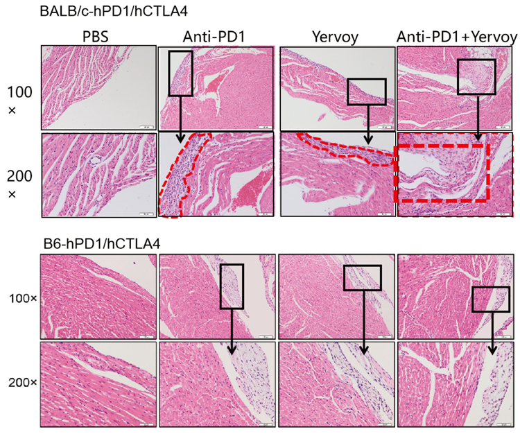 CTLA4的Yervoy药物对小鼠心脏产生不同程度的炎症损伤,BALB/c小鼠心脏的炎症损伤比B6背景小鼠严重。