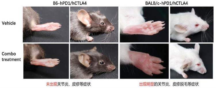 B6-hPD1/CTLA4背景小鼠模型对药物治疗具有耐受性;BALB/c-hPD1/hCTLA4背景的免疫检查点人源化小鼠模型能够重现临床中一些不良反应,是大分子、小分子的临床前药物毒性评价的理想模型。