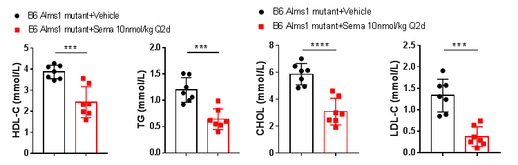 ͼ10. Semaglutide¿ÉÏÔÖø¸ÄÉÆB6-Alms1Í»±äСÊóµÄѪ֬Òì³£¡£Êý¾ÝÒÔMean¡ÀSDչʾ¡£Ê¹ÓÃunpaired two-tailed Student's t-test·½·¨½øÐÐͳ¼ÆÑ§·ÖÎö¡£***£¬p<0.001£»****£¬p<0.0001¡£