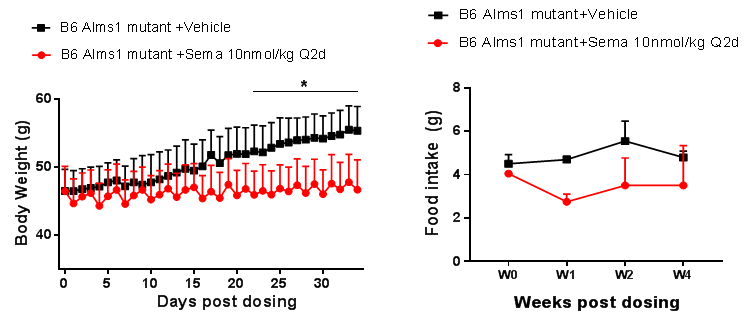 ͼ8. Semaglutide¸ÉÔ¤ÏÔÖø½µµÍÁËB6-Alms1Í»±äСÊóµÄÌåÖØºÍʳÎïÉãÈëÁ¿¡£Êý¾ÝÒÔMean¡ÀSDչʾ¡£Ê¹ÓÃunpaired two-tailed Student's t-test·½·¨½øÐÐͳ¼ÆÑ§·ÖÎö¡£*£¬p<0.05£»**£¬p<0.01£»***£¬p<0.001¡£