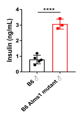 ͼ3. C57BL/6-Alms1-delСÊóÒȵºËØË®Æ½Ïà±È¶ÔÕÕ×éÏÔÖøÉý¸ß¡£Êý¾ÝÒÔMean¡ÀSDչʾ£¬n=5¡£Ê¹ÓÃunpaired two-tailed Student's t-test·½·¨½øÐÐͳ¼ÆÑ§·ÖÎö¡£****£¬p<0.0001¡£