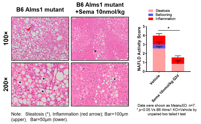 ͼ12. SemaglutideÏÔÖø¸ÄÉÆÁËB6-Alms1Í»±äСÊóµÄ¸ÎÖ¬·¾±äÐÔ¡¢Ñ×Ö¢ºÍϸ°û¿ÕÅݲ¡±ä¡£Êý¾ÝÒÔMean¡ÀSDչʾ¡£Ê¹ÓÃunpaired two-tailed Student's t-test·½·¨½øÐÐͳ¼ÆÑ§·ÖÎö¡£*£¬p<0.05¡£
