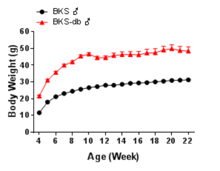 图2. BKS-db小鼠自4周龄后体重迅速增长。数据以Mean±SEM呈现。