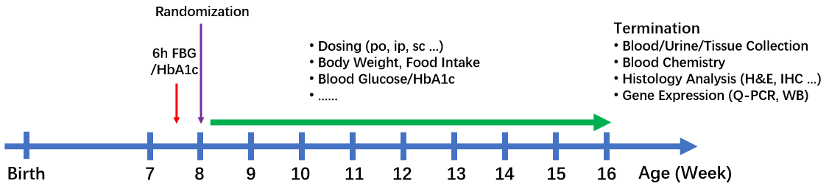 图1. BKS-db模型研究概览。实验阶段:8-12周,用鼠量:10-12只/组,5-8组。