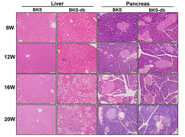 图7. BKS-db小鼠12周龄后肝脏出现明显的脂肪变性,并且胰腺中的胰岛组织结构紊乱。