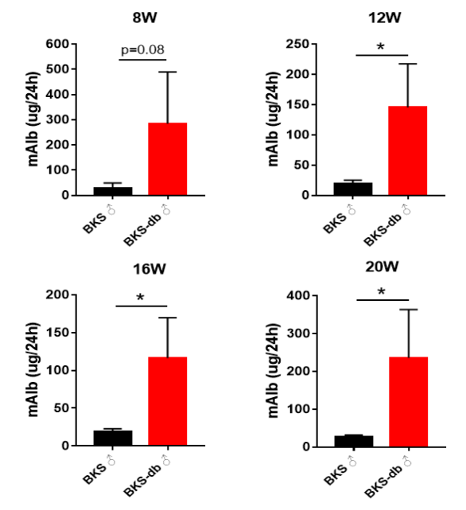 图8. 12周龄后BKS-db小鼠24h尿液中mAlb的水平显著提高。数据以Mean±SD展示。