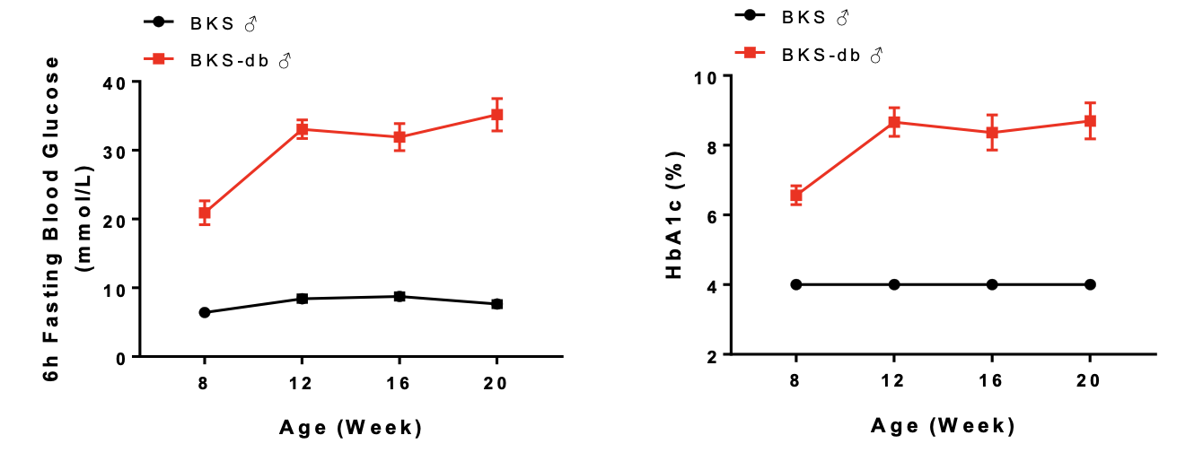 图3. BKS-db小鼠血糖较对照显著升高,并在8周龄后维持稳定。数据以Mean±SEM展示,n=6。
